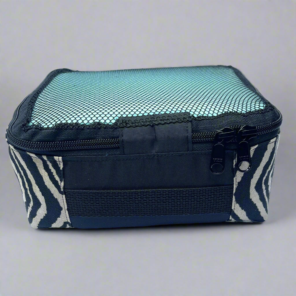 When finished, your packing cube will have a sport mesh see-through top, a YKK zipper with mirrored zipper pulls, and a color inset with a carrying strap for your convenience.